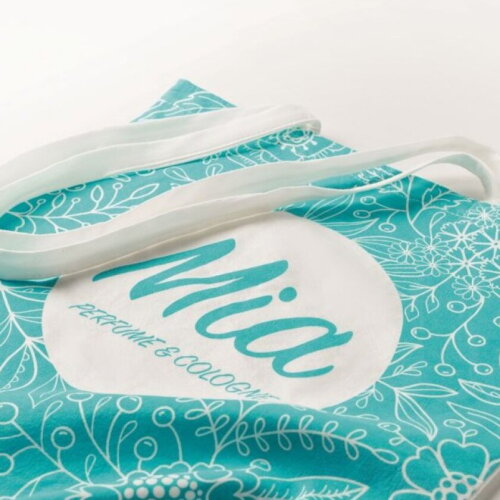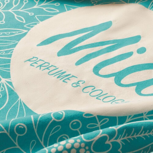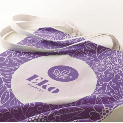 Op maat gemaakte katoenen boodschappentas met lange hengsels. Afmeting tas: 38x42cm, hengsels 70x2cm.